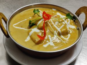 Yrtti-jogurttimarinoituja ja tandoori-uunissa paistettuja kanan rintafilee paloja tomaatti, voi, cashew ja kermakastikkeessa.